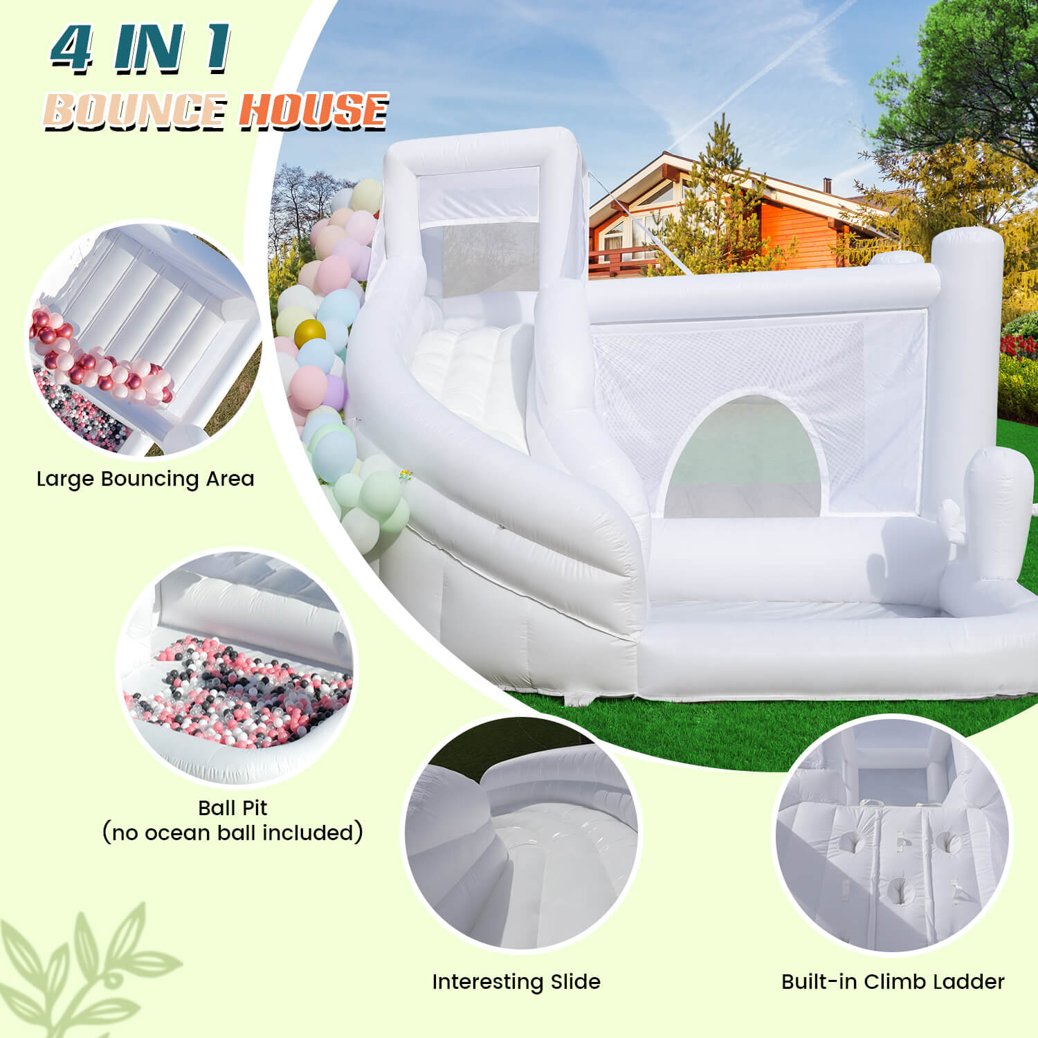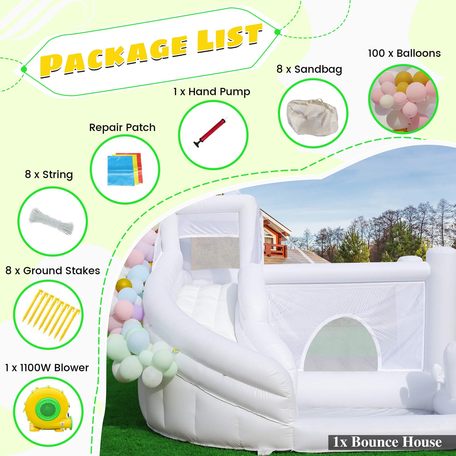 Everything you need is included: inflatable jump house, air blower, storage bag, anchor stakes, balloon and vinyl repair patches. Get the fun started right out of the box – no extra accessories needed!