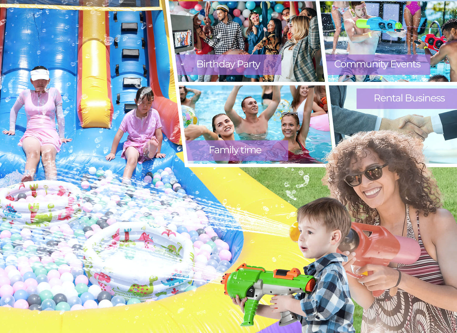 Bounce House Water Park: Our blue blow up water slide gives your teenagers endless entertainment. Watch them climb, zoom down the slides and splash in the 1.3ft deep pool—all in one action-packed setup. Whether wet or dry, it's the ultimate playground for adults and teenagers aged 8 and up