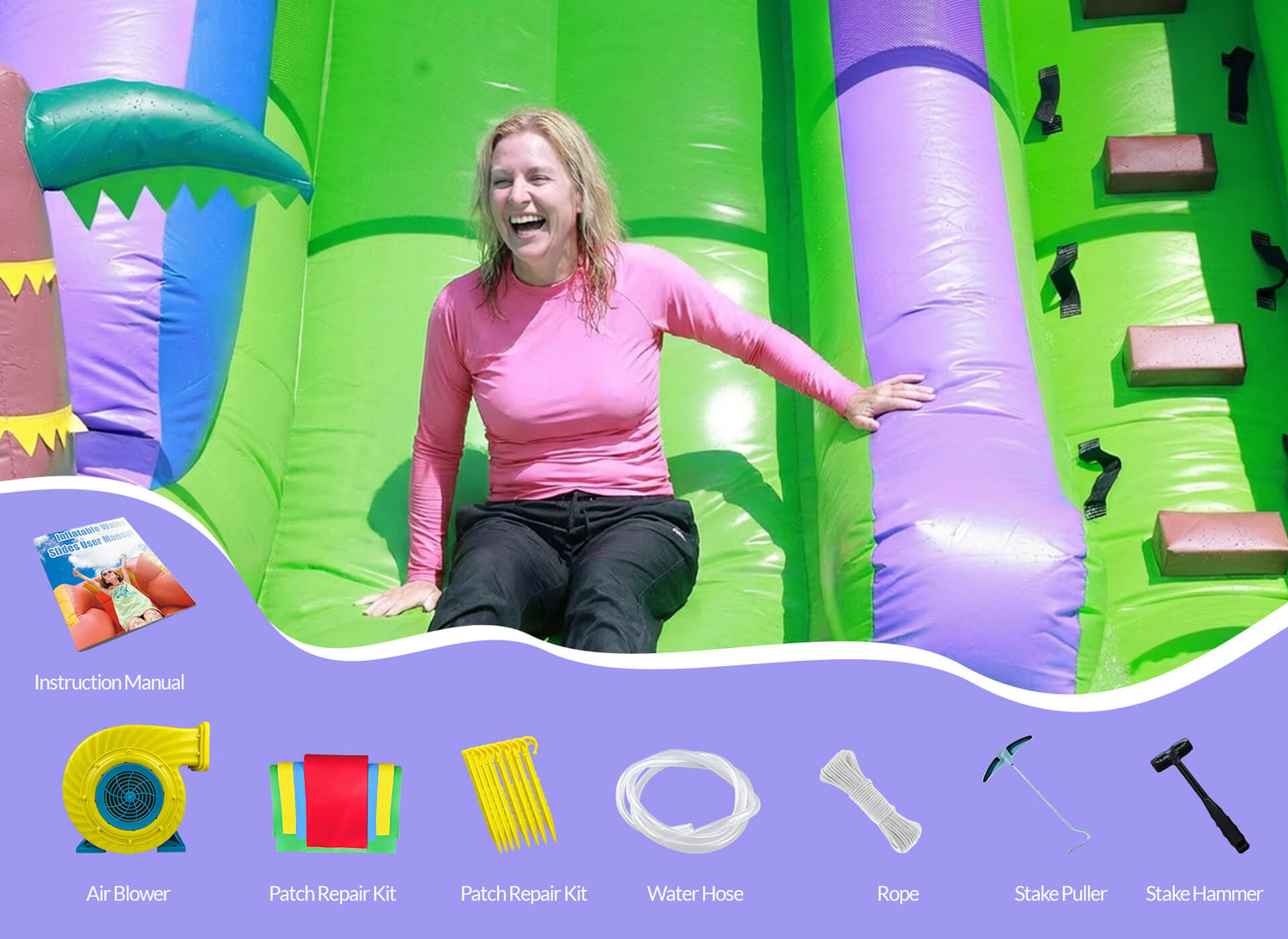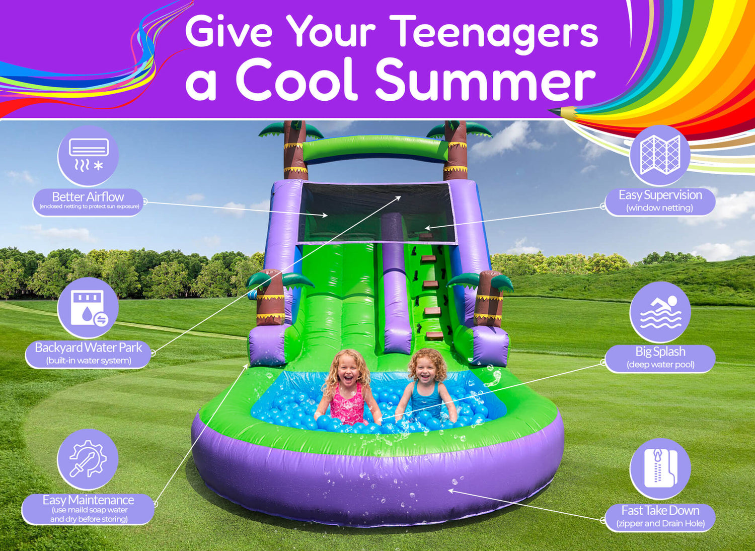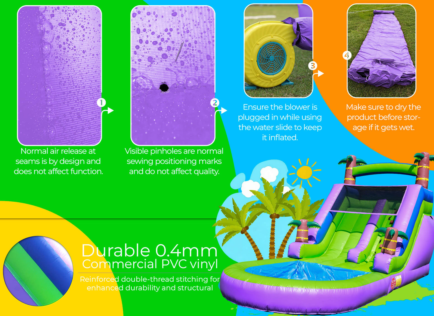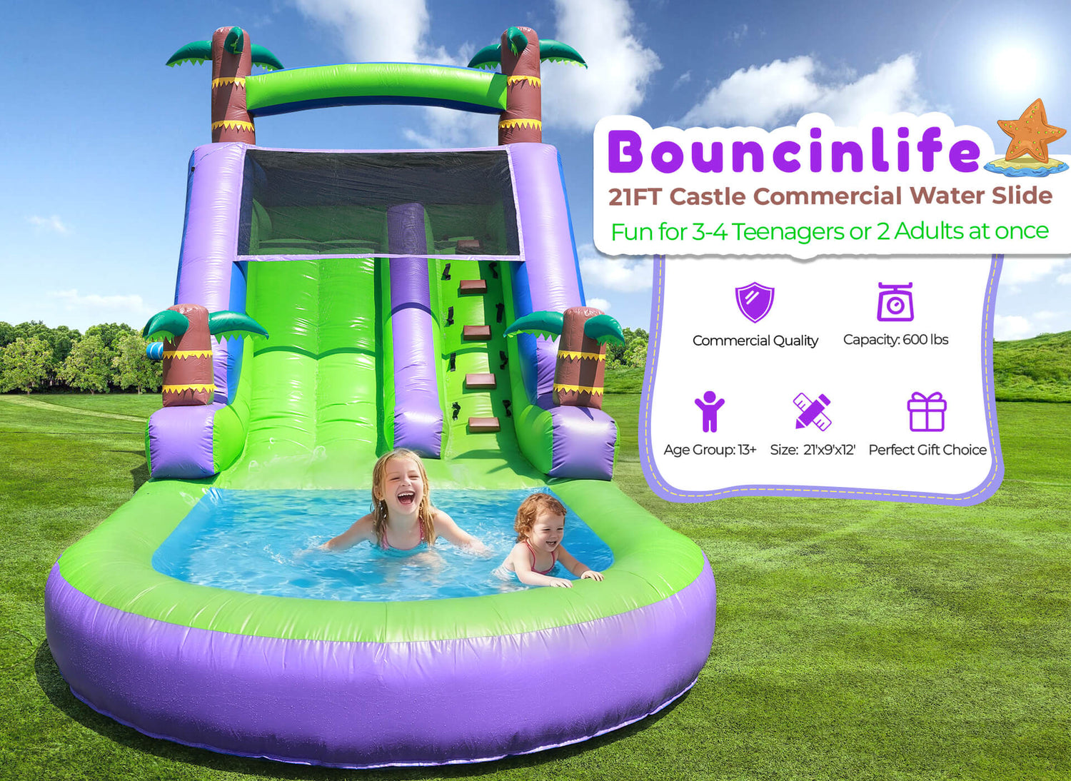 Elevate your backyard fun with our tropical inflatable water slide. Measuring 21' L x 9' W x 12' H, this spacious bounce house water park safely holds 3-4 teens or 2 adults (250 lbs/person, 600 lbs total), perfect for family summer adventures.