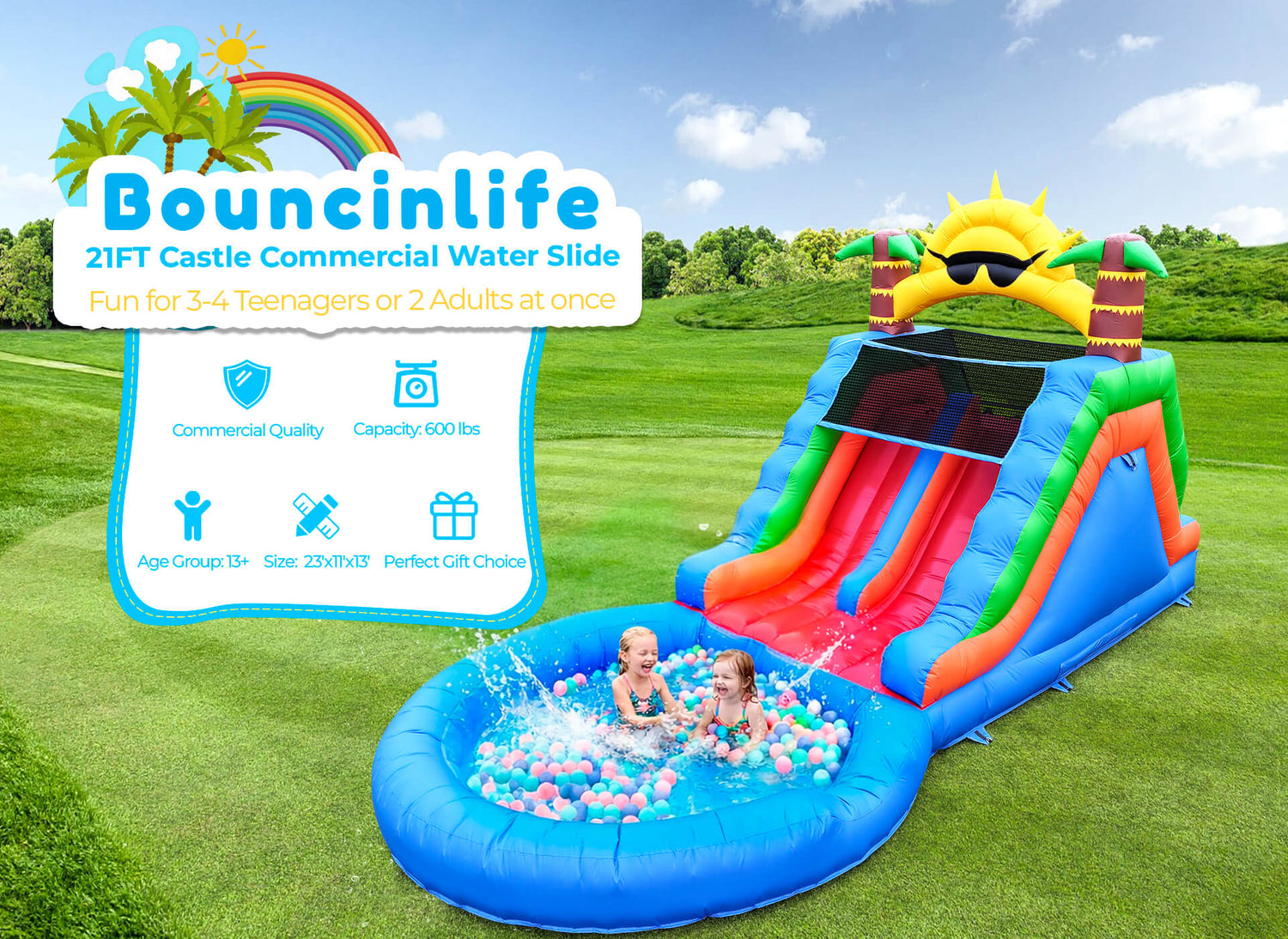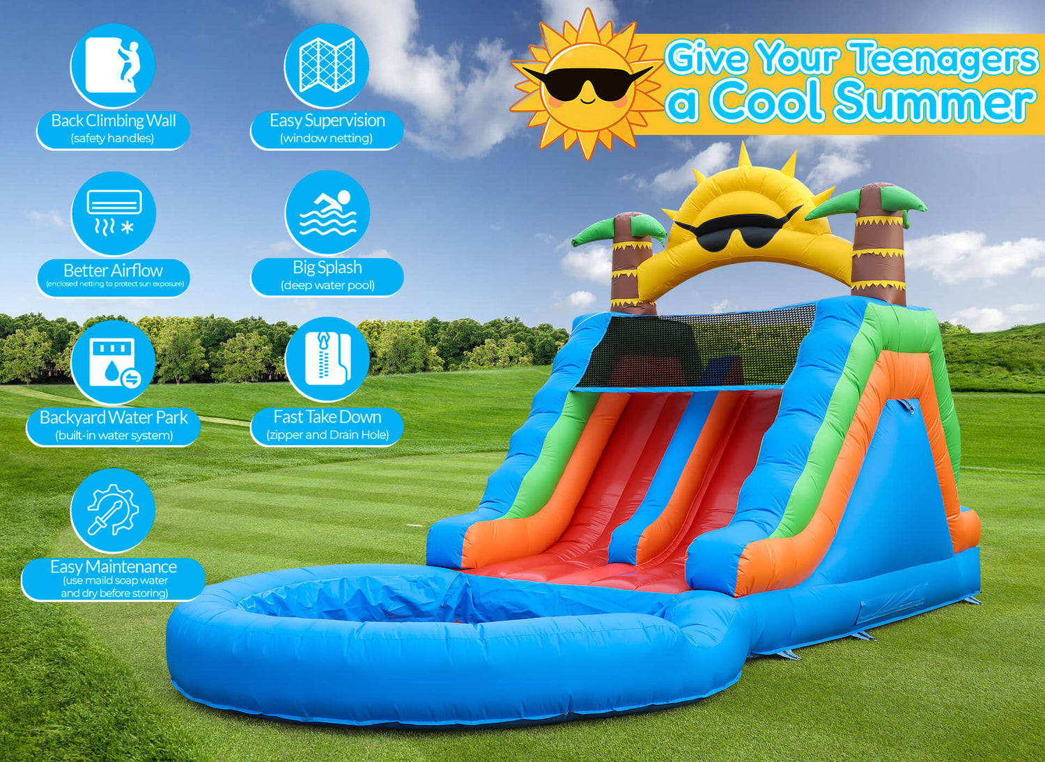 Featuring sunny-themed design, this water park includes an 9ft wide splash pool and back climbing wall, transforming any yard into a entertainment hub. Perfect for teens, adults, and family fun, it’s your go-to for thrilling, resort-style aquatic adventures right at home.