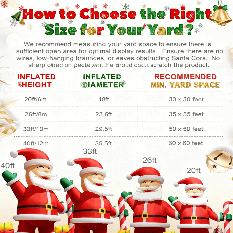 Choose from 2 sizes (26/33ft) to lit up any outdoor space. When inflated, this product becomes a massive structure, standing 26ft/ 8m tall and spanning 22ft/ 6.7m in width. To avoid return disappointment, we strongly recommend having a flat, open area of at least 35 x 35ft/ 10.7 x 10.7m. This space is crucial for ensuring stability and optimal display.