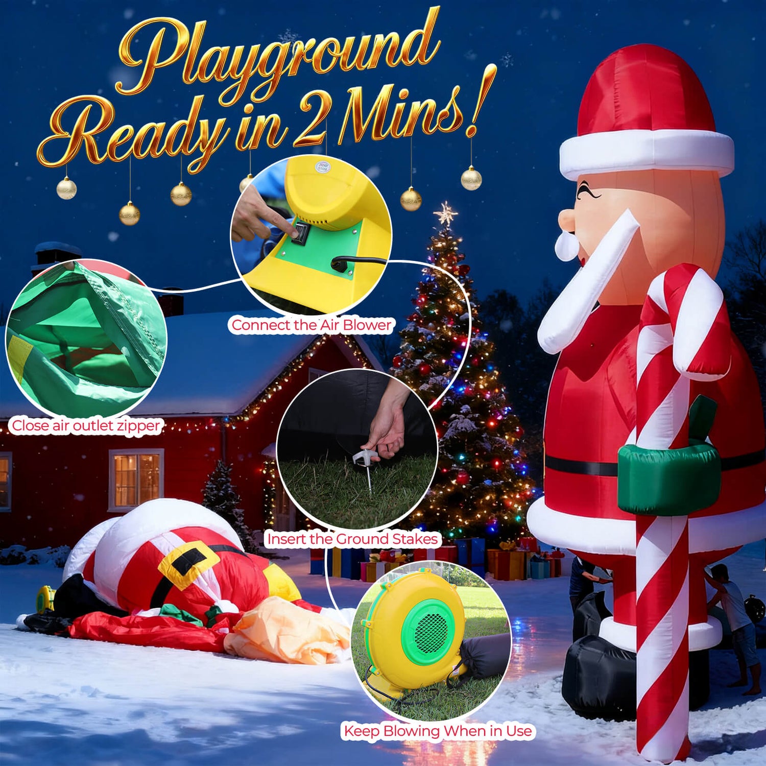 Finally, inflate Santa Claus while he is lying flat. Once he is fully inflated, you can then pull him upright.