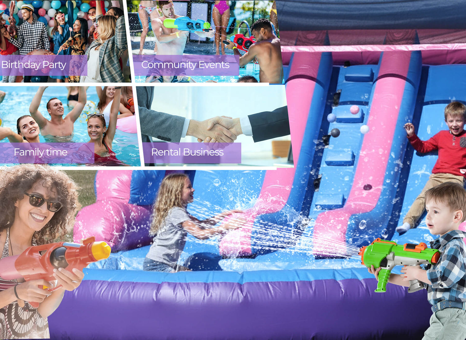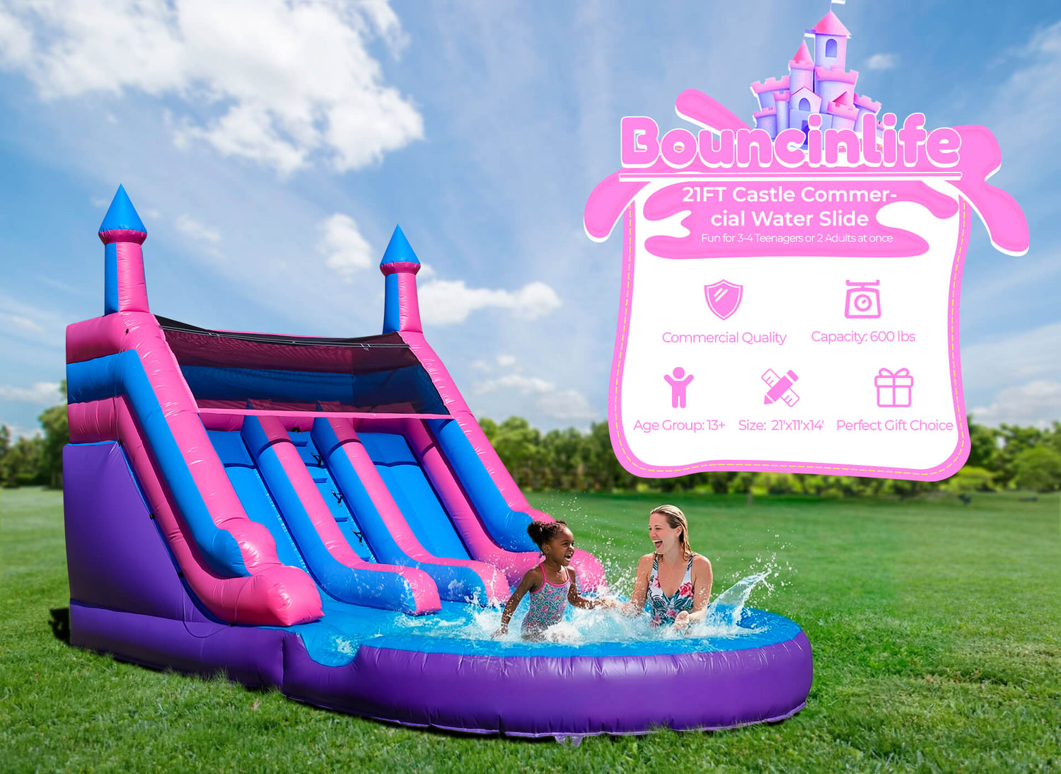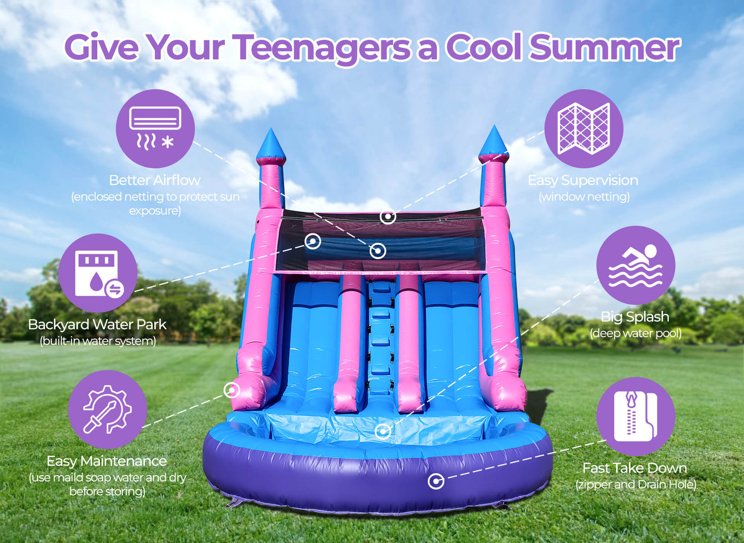 Featuring a vibrant purple and pink castle design, this dual-slide includes an 7ft wide splash pool, transforming any yard into a summer entertainment hub. Perfect for teens, adults, and family fun, it’s your go-to for thrilling, resort-style aquatic adventures right at home.