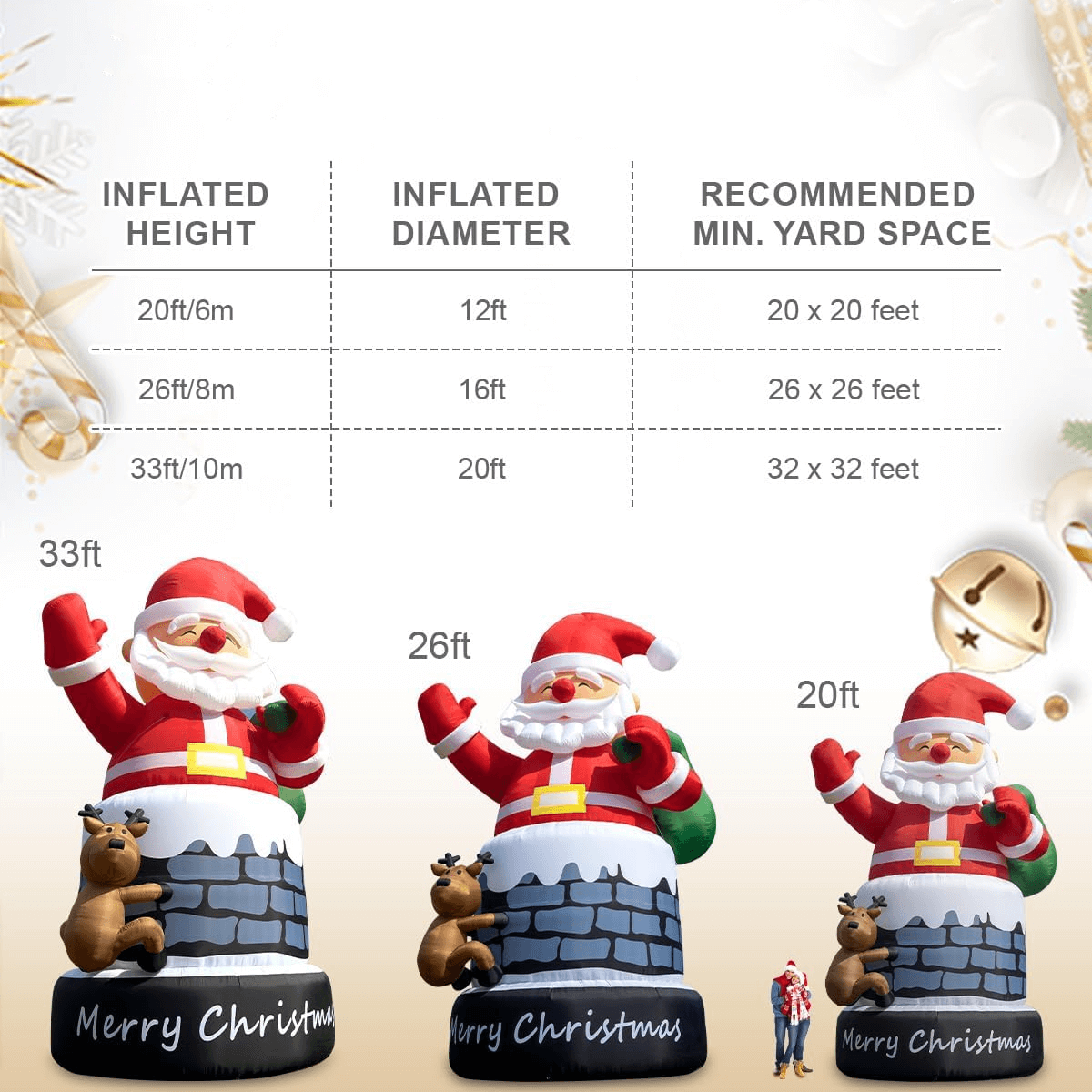 When inflated, this product stands 26ft/7.9m tall and spans 16ft/ 4.9m wide. To showcase its full impact and ensure safe stability, we recommend a flat, open area measuring at least 26 x 26ft (7.9 x 7.9m). Be sure to measure your space before purchasing!